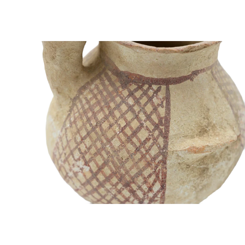 This ancient short pot reflects centuries-old craftsmanship, with subtle imperfections and earthy tones that tell the story of its origins in early pottery traditions.